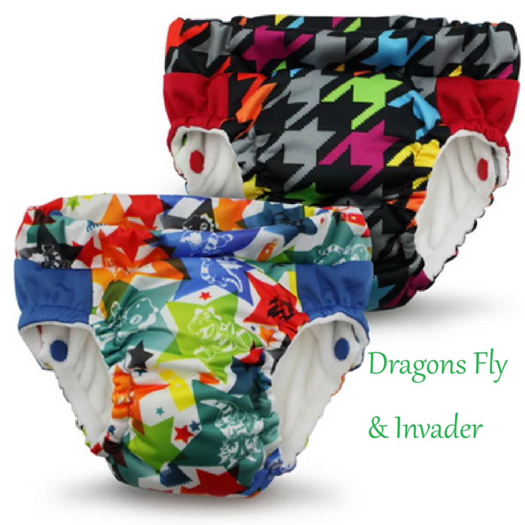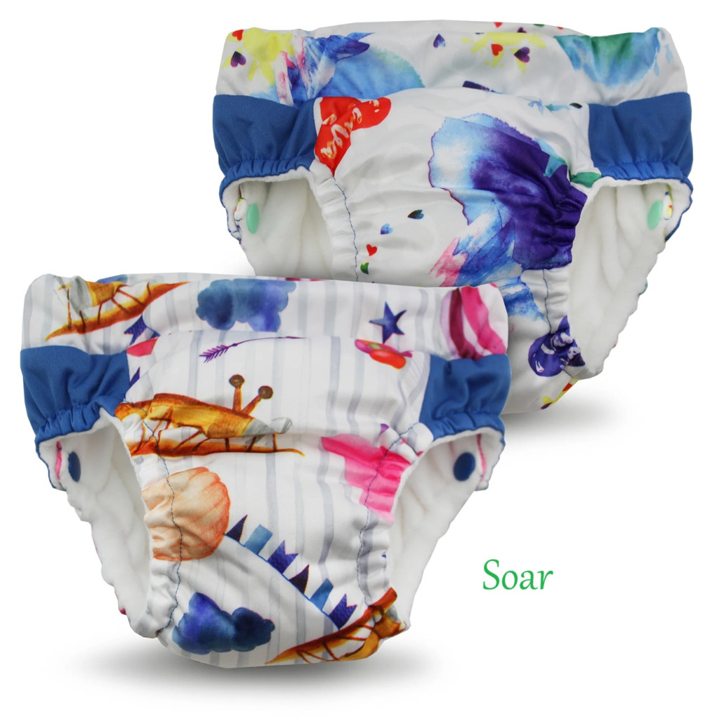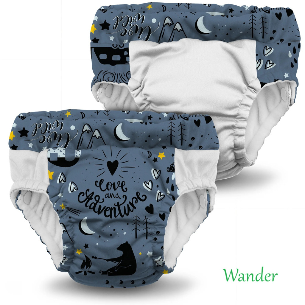 A Lil Learnerz négy méretben kapható, az extra kicsitől a nagyig. Az extra kicsi és kicsi méretek oldalsó patentos megoldással is rendelkeznek, így baleset esetén könnyen levehetők, különösen a szobatisztaságot most tanuló gyerekeknél.