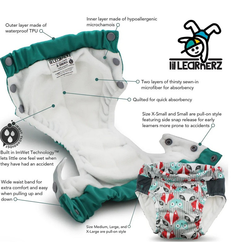 A Lil Learnerz négy méretben kapható, az extra kicsitől a nagyig. Az extra kicsi és kicsi méretek oldalsó patentos megoldással is rendelkeznek, így baleset esetén könnyen levehetők, különösen a szobatisztaságot most tanuló gyerekeknél.